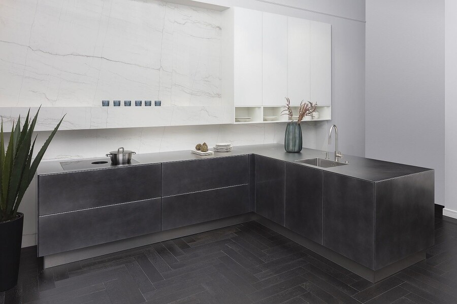 Metall-Elemente haben in Küchen immer schon schick ausgesehen. Sogar der Look komplett aus Edelstahl in Industrieküchen-Optik ist heute in Privathaushalten angesagt. Edelstahl ist aber auch sehr empfänglich für Fingerabdrücke und mit seiner gegebenen Kälte nicht so angenehm anzufassen.